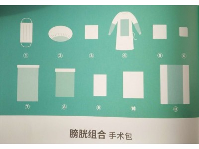 手术包配置:一次性使用医用口罩1个、一次性使用帽1个、擦手巾(40*40cm)2块、一次性使用手术衣(加强型)2件、纱布块10块、器械盘套1条、臀垫单1条、脚套1块、一次性使用医用垫单1条、一次性使用包布1条。